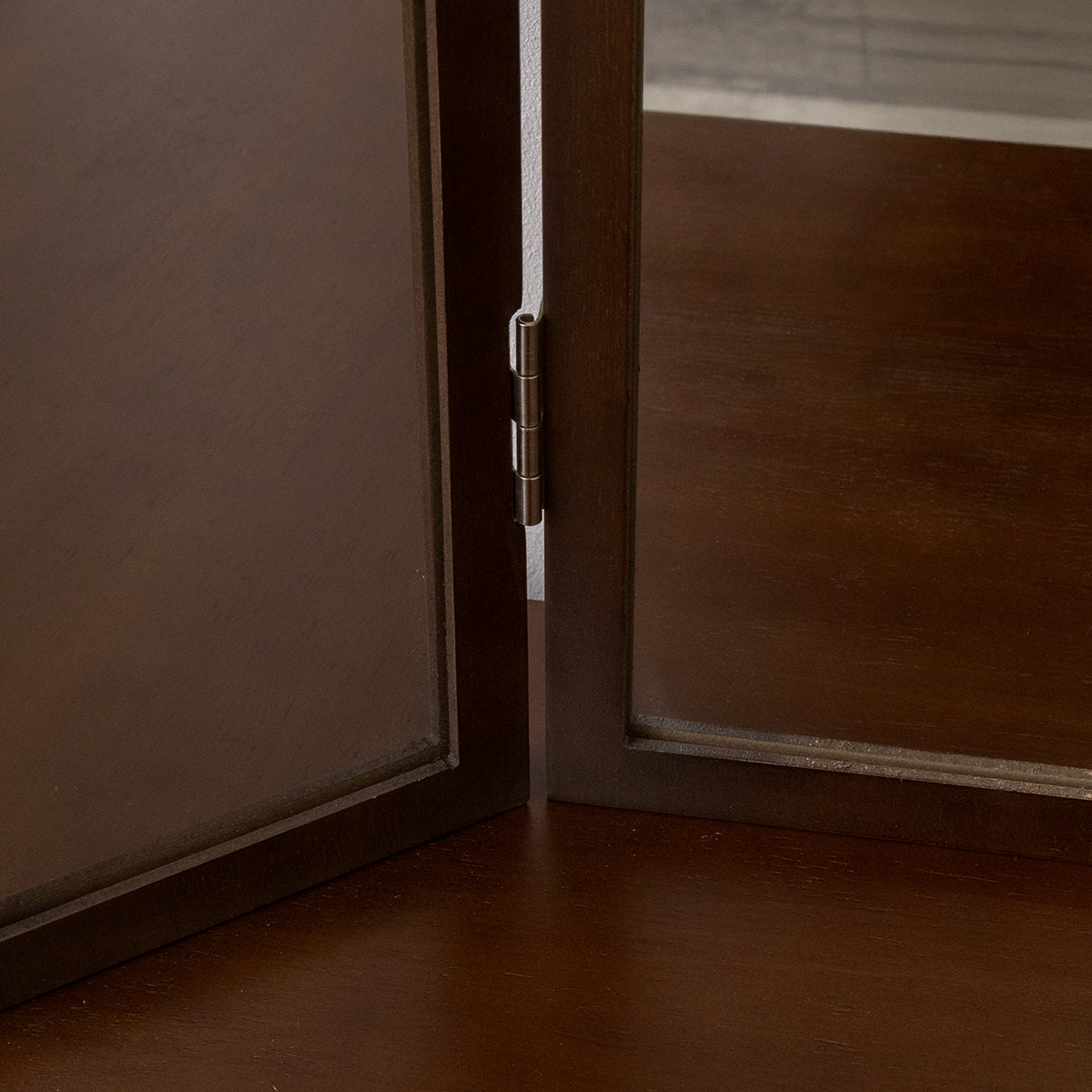 This Dark Brown Wooden Arched Dressing Table Mirror from the Georgian Range is a beautiful, vintage inspired table top mirror, perfect for any bedroom, dressing room or bathroom space. This item is made from Wood and Glass. This mirror has a curved style and Triple mirror design.