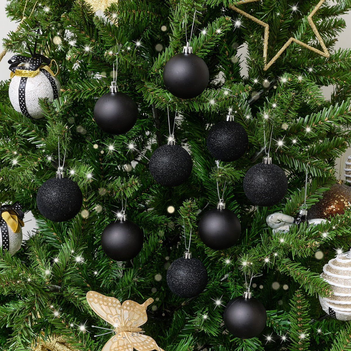 This Set of 10 Mixed Glitter Black Baubles are a bold, stylish collection of baubles, perfect for fans of black decor and glittery finishes. Made of resin, this pack of 10 comes in a mix of two different designs, 5 matt black and 5 black glitter.