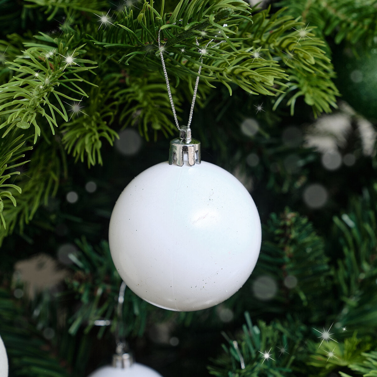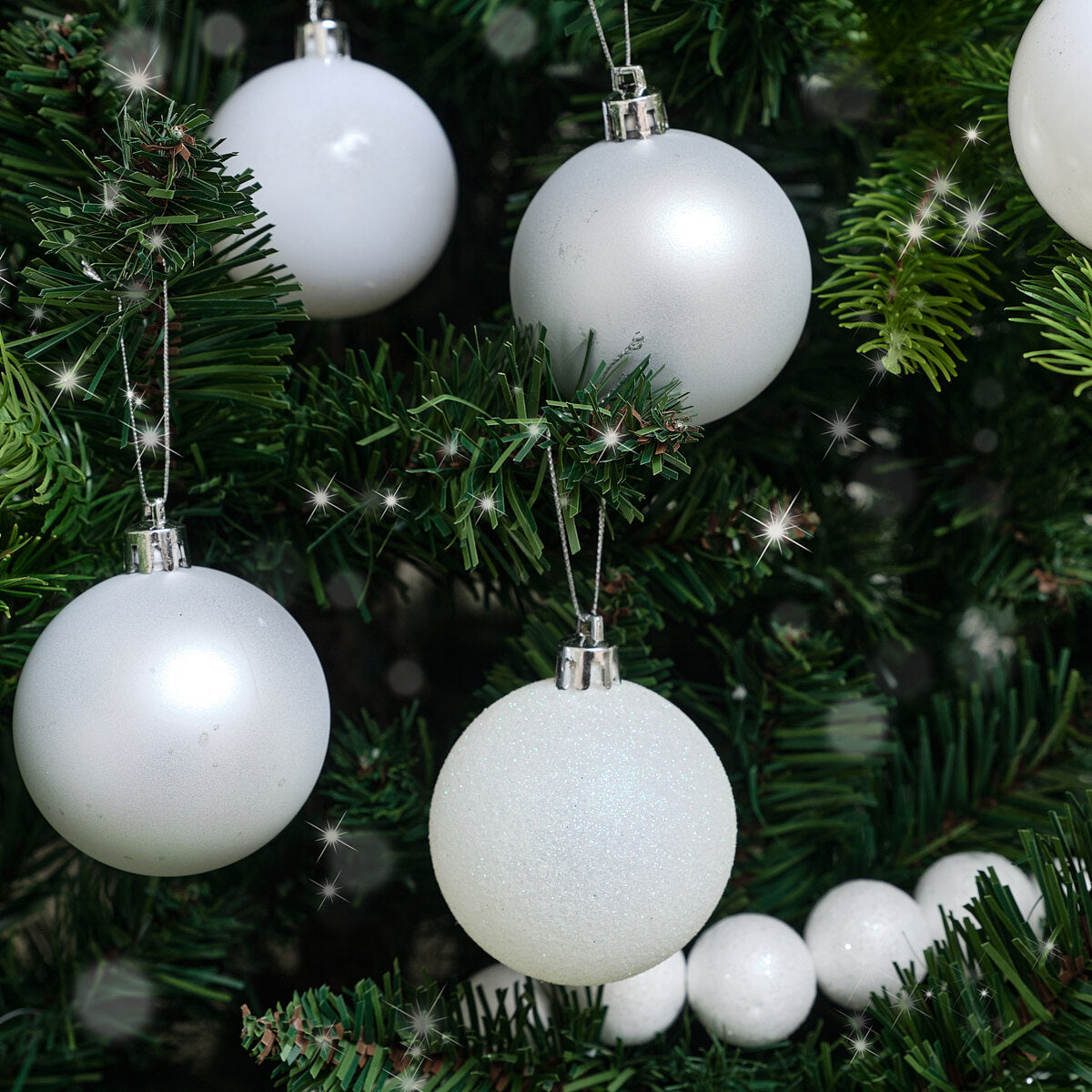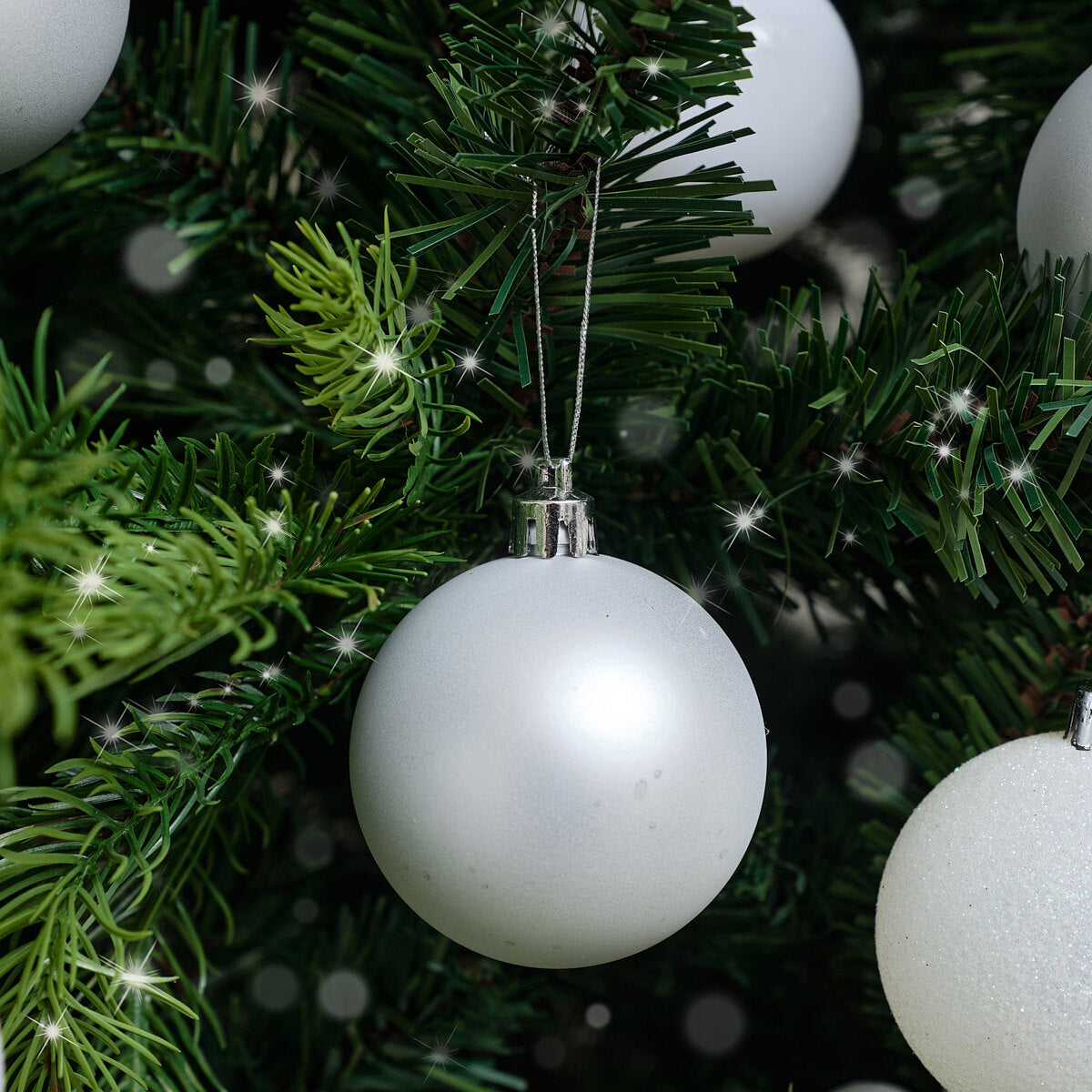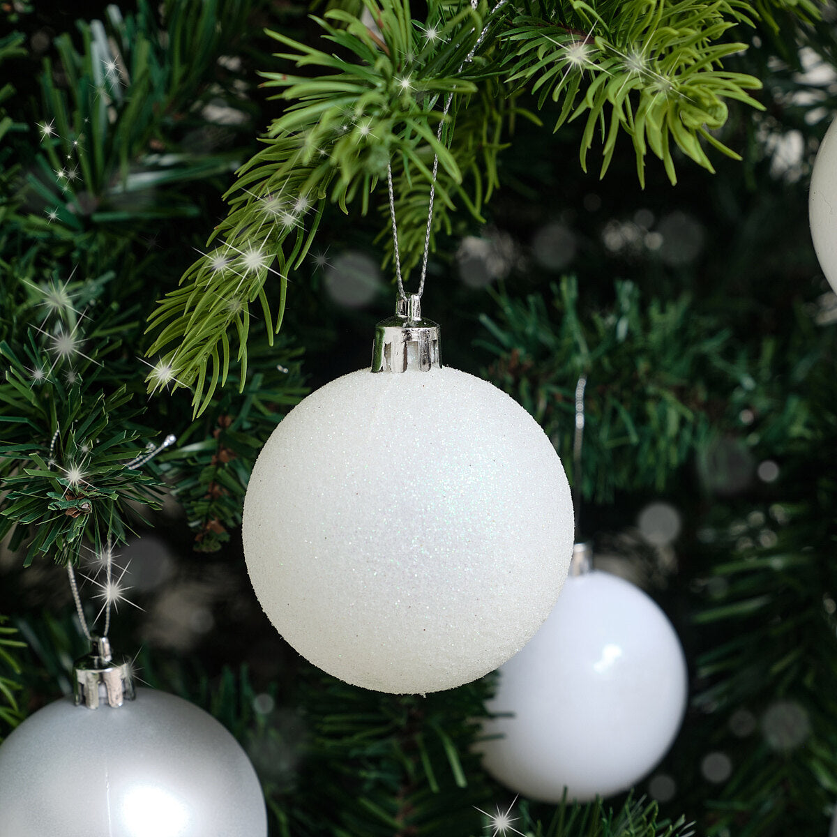 This Set of 10 Mixed Glitter White and Silver Baubles are a bold, stylish collection of baubles, perfect for fans of white decor and glittery finishes. Made of resin, this pack of 10 comes in a mix of three different designs, matt, glitter and shiny.