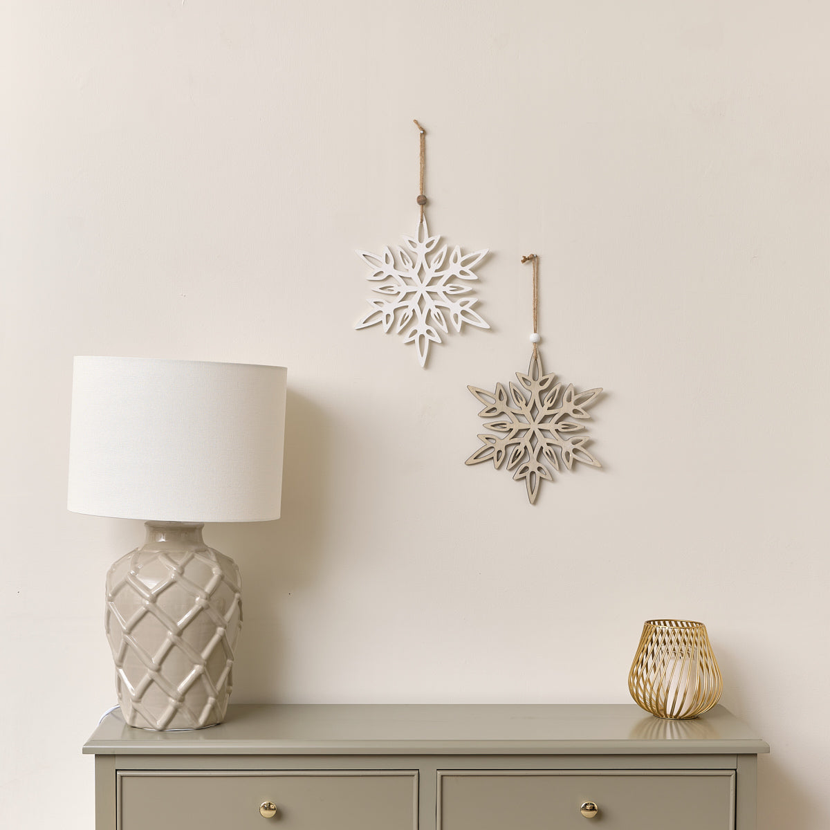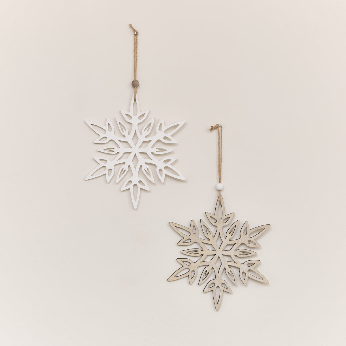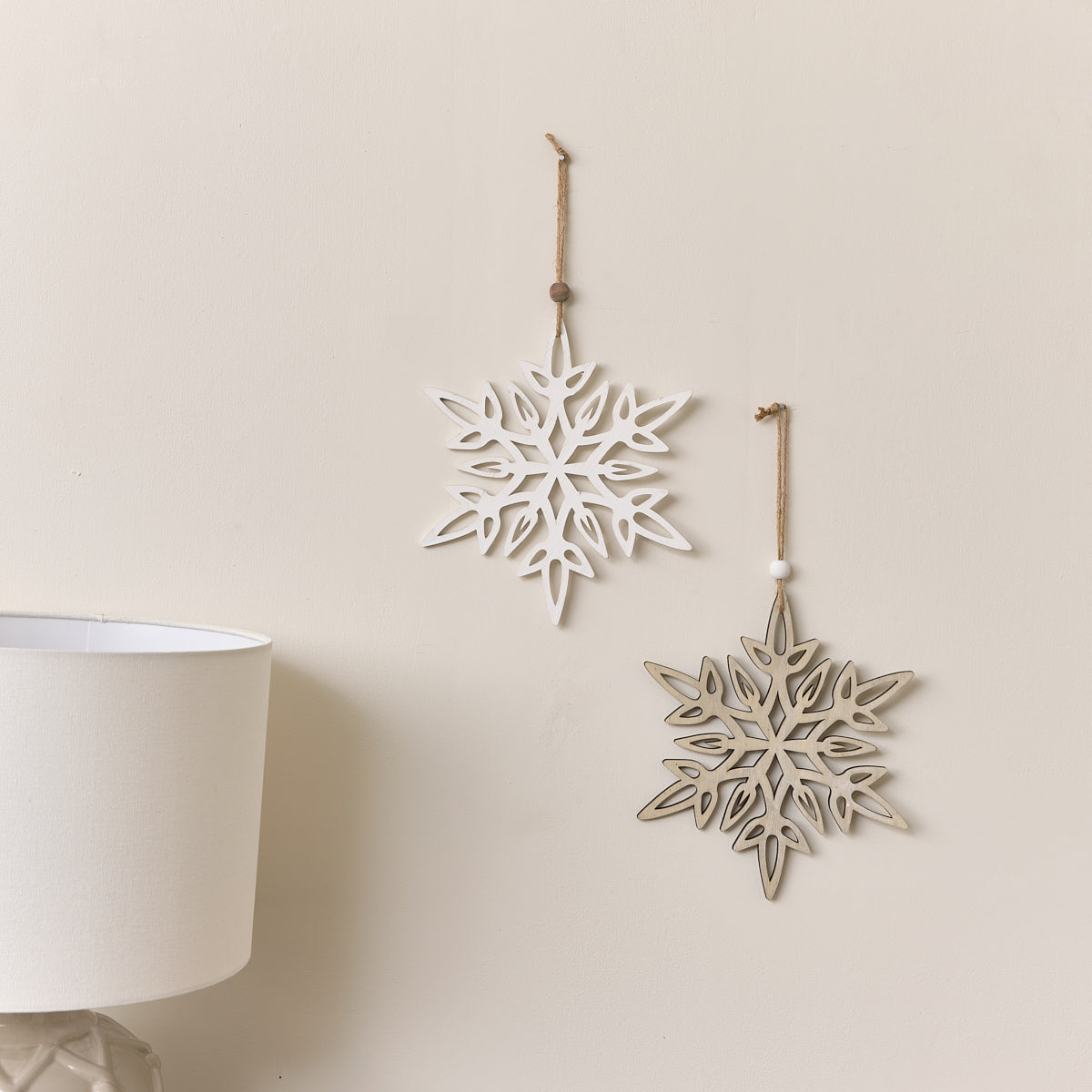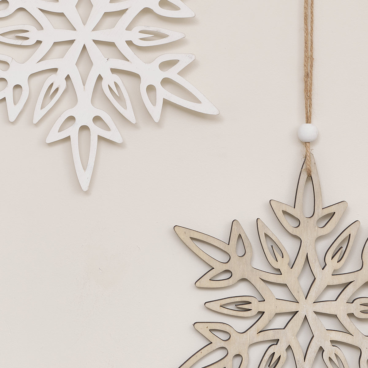 This Set of 2 Large White & Rustic Wooden Hanging Christmas Snowflakes are a simple, scandi inspired wall hanging Christmas decoration, perfect for lovers of rustic finishes and whimsical design. Made of wood and string, this set is assorted and comes with two different designs. Each has a classic snowflake shape with one finished in a painted white and the other with a natural rustic wooden finish.