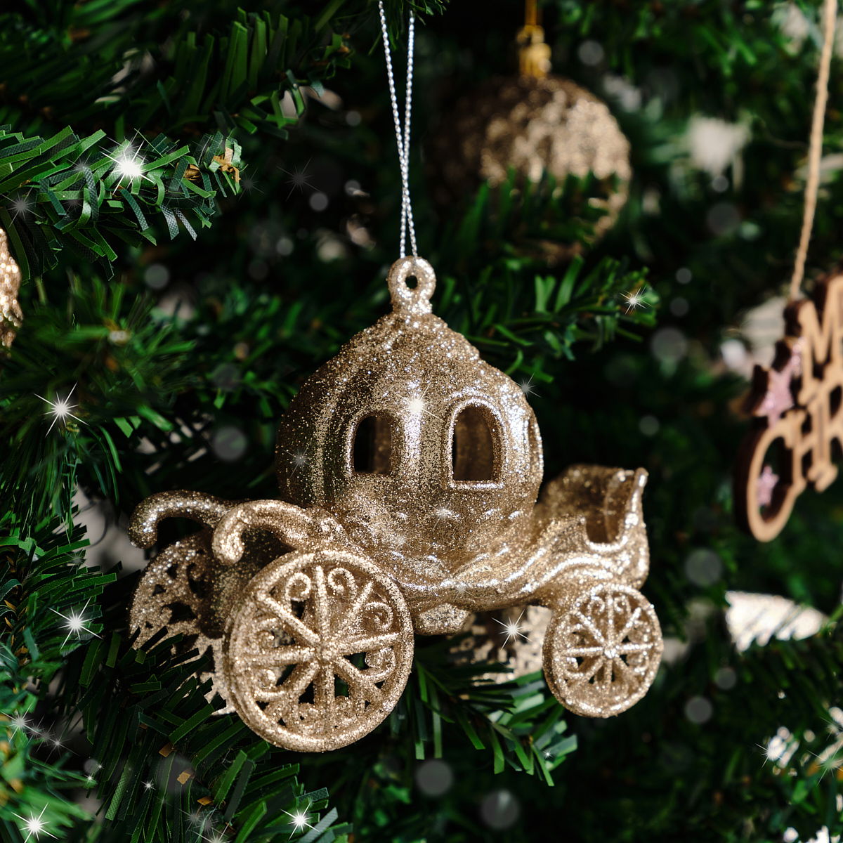 This Set of 3 Gold Glitter Princess Carriage Baubles are a beautiful, glamorous set of festive decorations, perfect for lovers of gold decor and whimsical design. Made of resin, these baubles have a classic princess carriage design and come with a gold glitter finish.