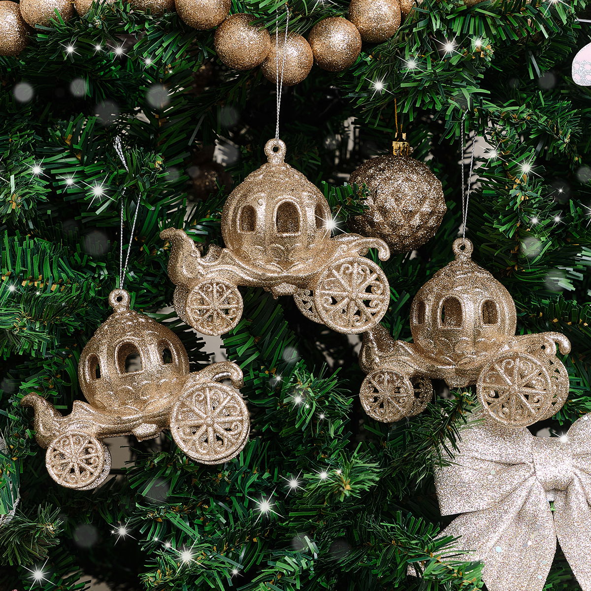 Set of 3 Gold Glitter Princess Carriage Baubles