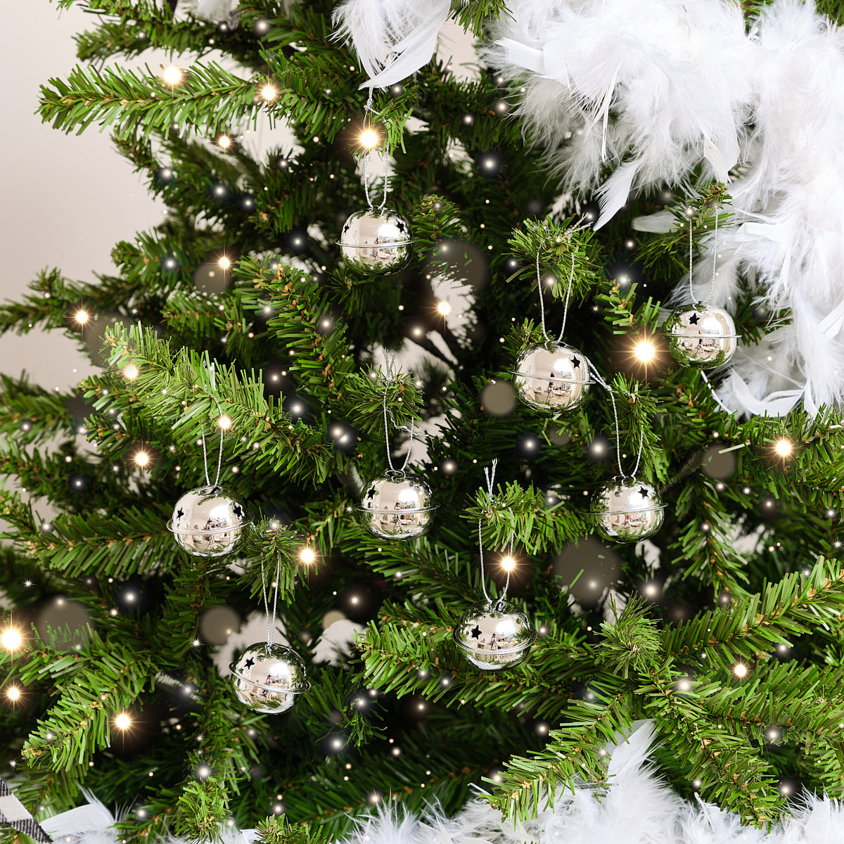 This Set of 8 Silver Hanging Bell Christmas Decorations - 4cm would make beautiful Christmas tree decor for those who love Silver decor! This set of eight hanging baubles are made of metal and come in a metallic mirrored silver finish with a traditional bell design. They can be hung via matching silver ribbons on each bauble and include a jingle bell inside.