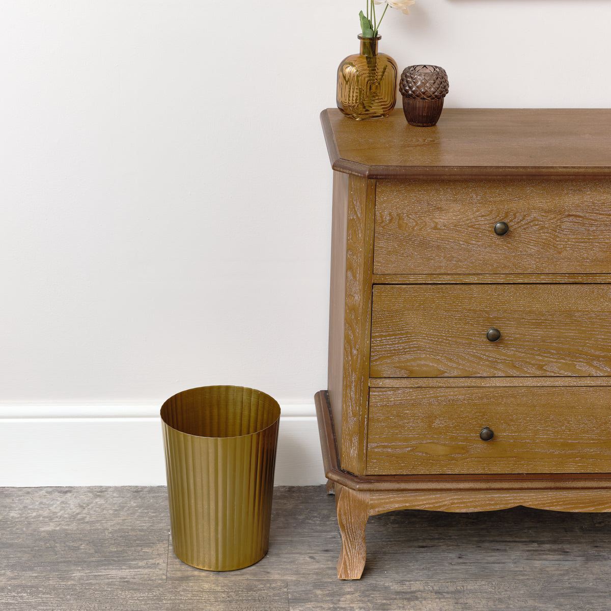 This Shiny Gold Reeded Metal Paper Bin 21cm x 27cm is a great way to bring a touch of glamour to your home decor. Perfect for placing in a bedroom, bathroom or office space. The bin is made from metal in a round design with a reeded edge detailing and comes with a shiny, metallic gold finish.